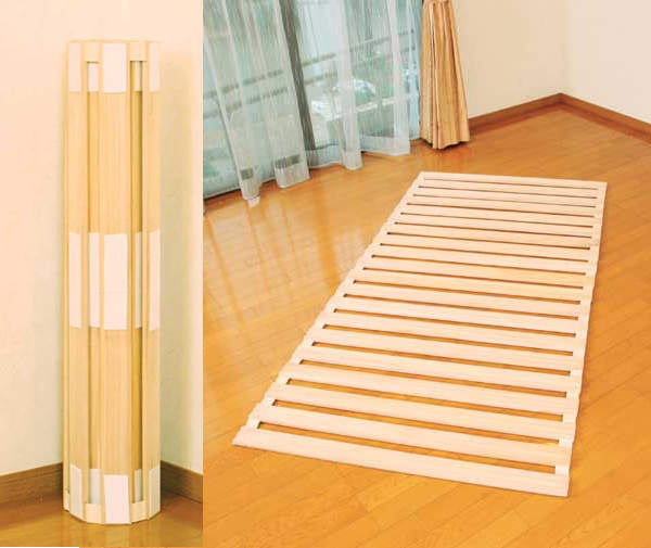 丸めることで部屋の隅に収納できる省スペース設計のロール式すのこベッド。