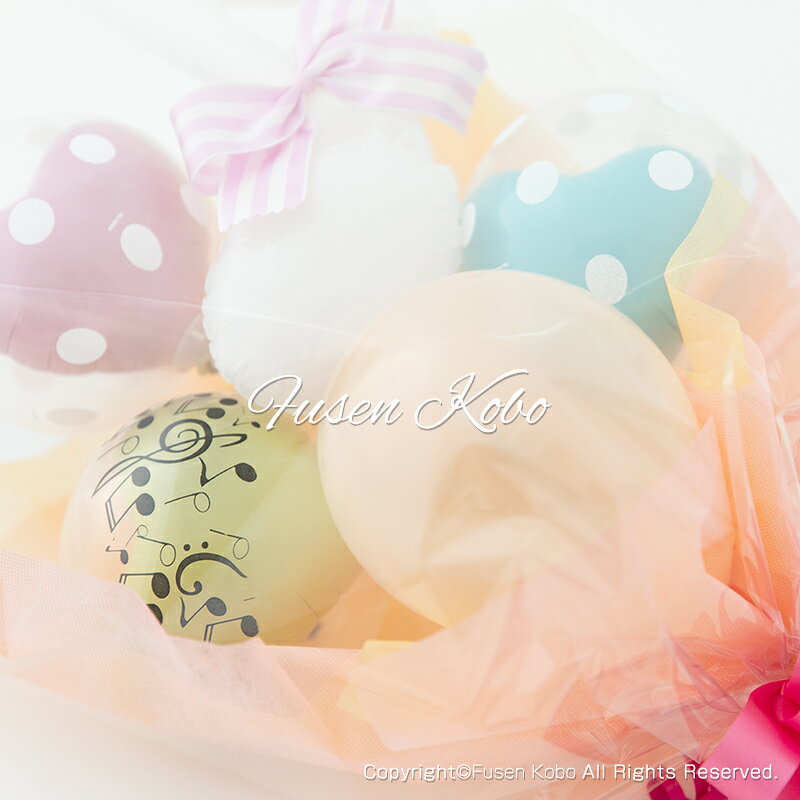 ドットと音符の柄が入った、手に持つ花束調のバルーンギフトです。